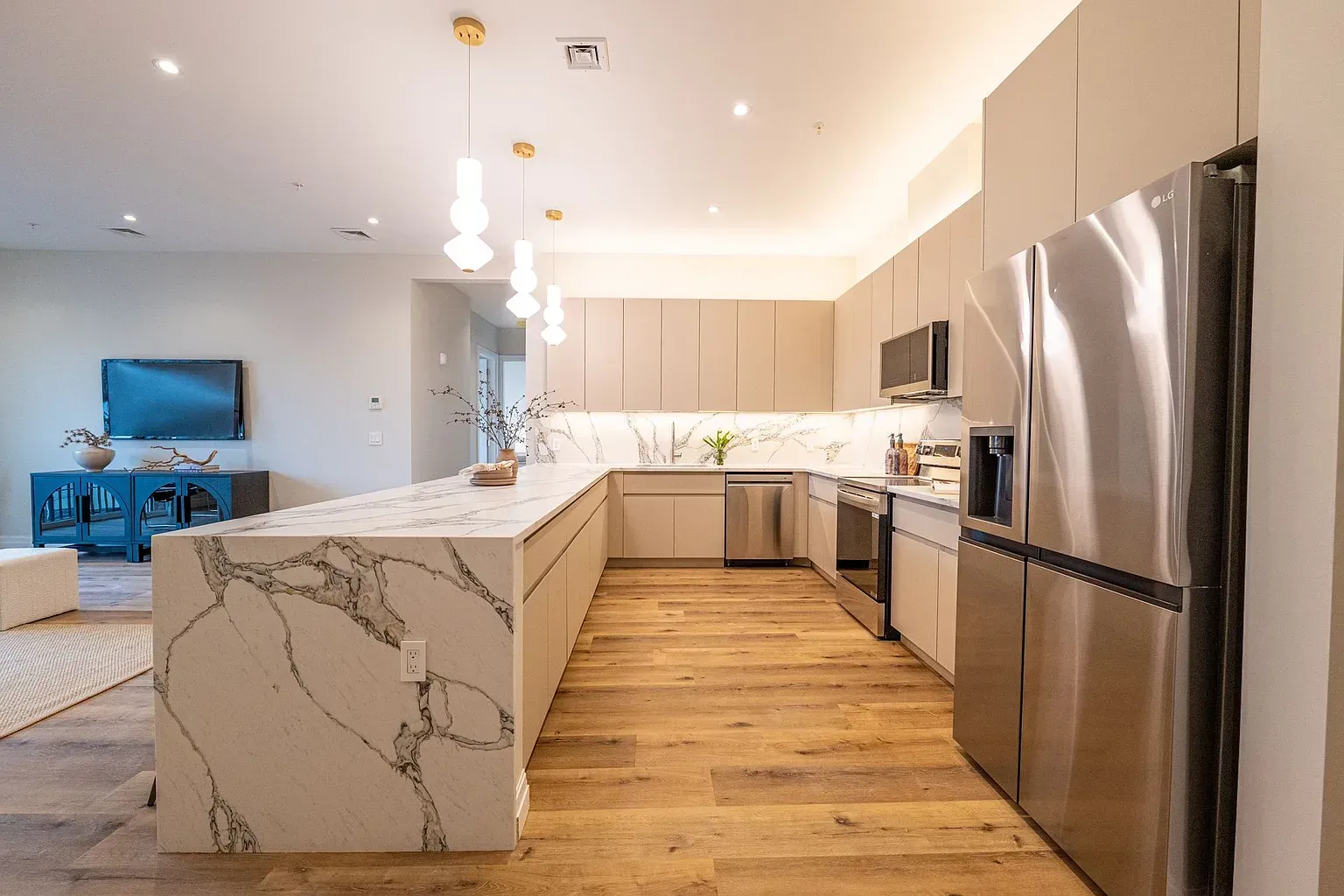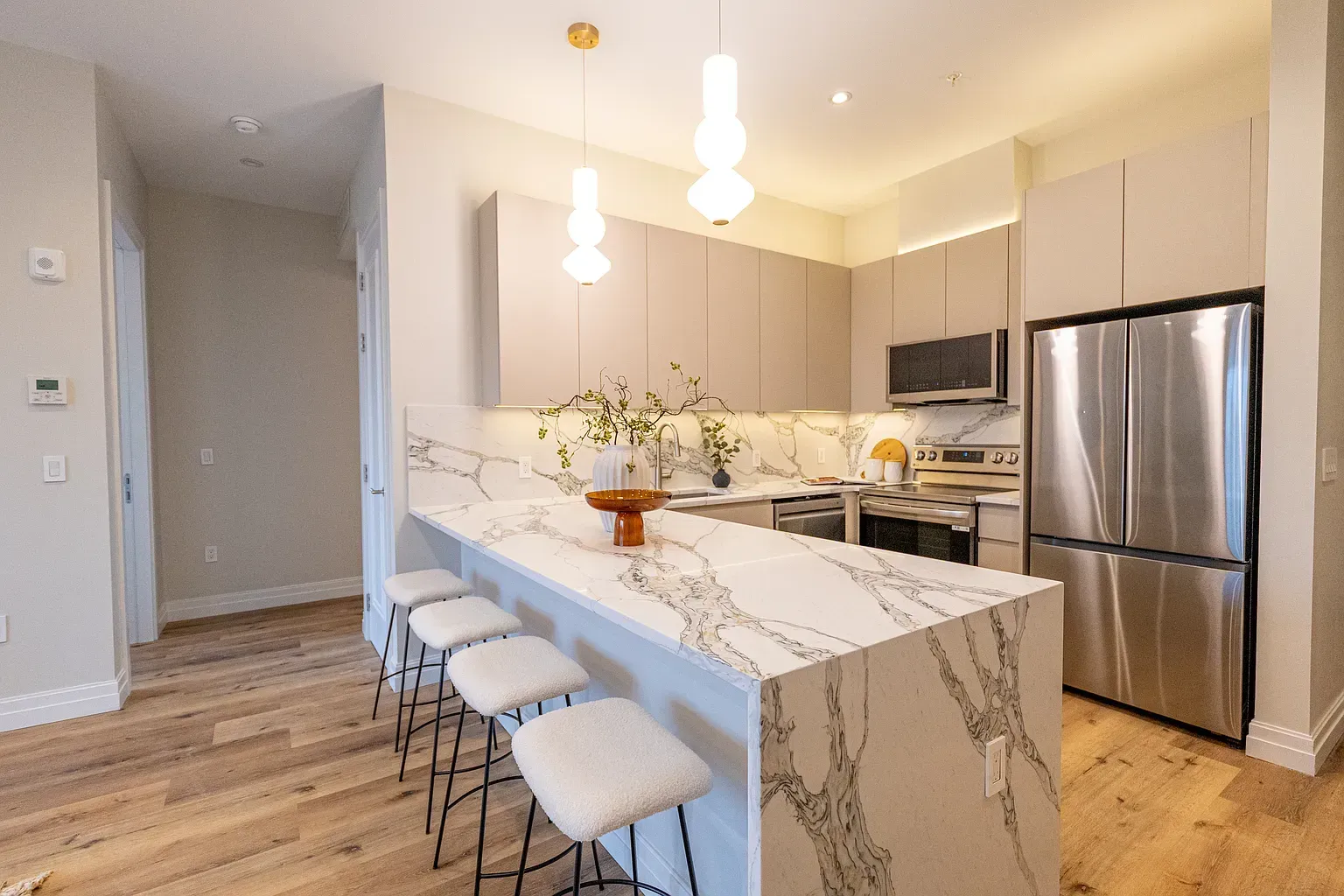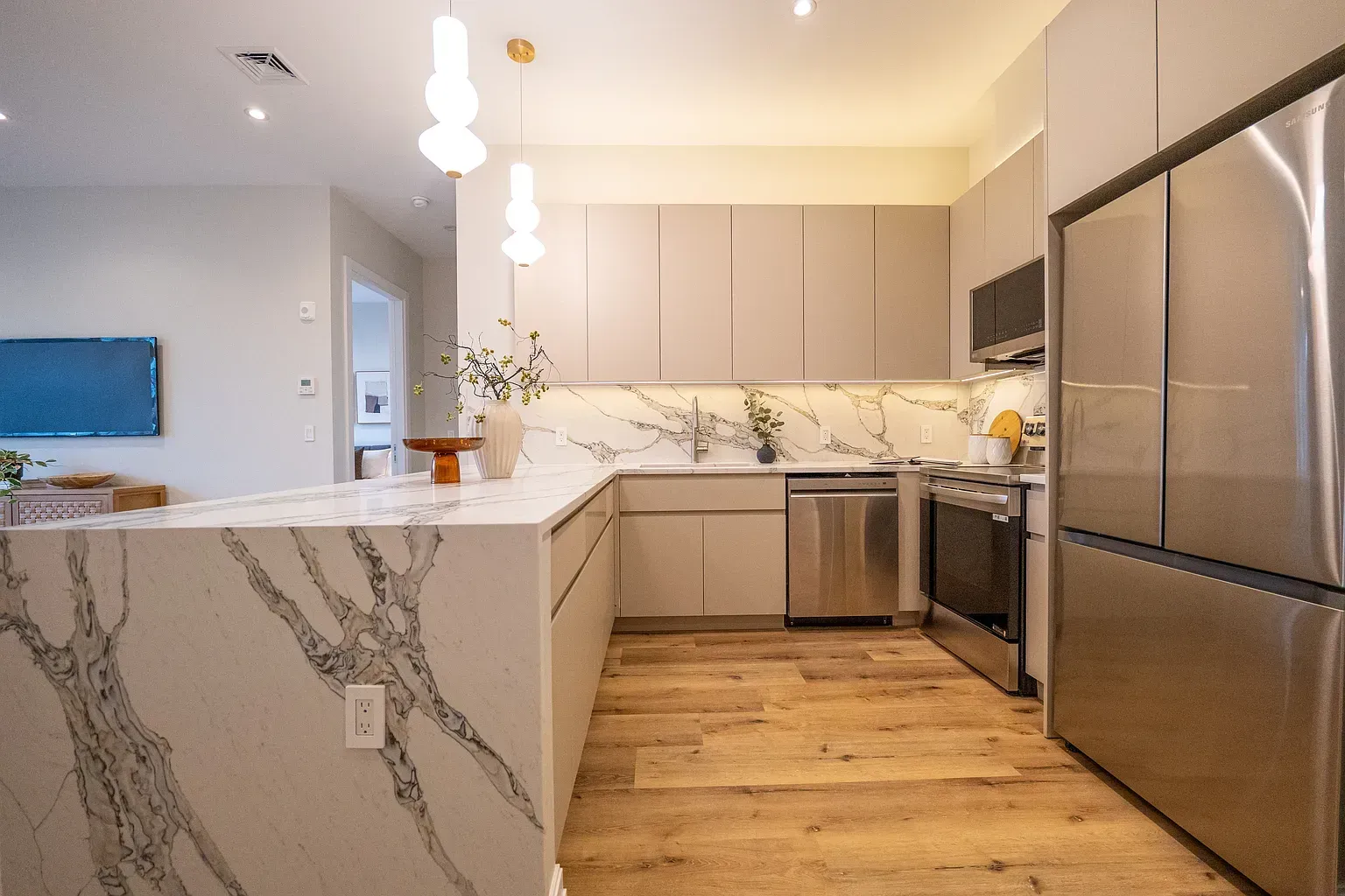 Choose from magazine-designed one-bedroom or two-bedroom layouts and enter a space where modern convenience meets exquisite design. Your dream apartment features massive waterfall island kitchens stretching over 10 feet, adorned with deep-veined Calacatta grey quartz countertops and backsplashes. Custom soft-close cabinetry and premium stainless-steel appliances, including a side-by-side refrigerator with a water and ice maker, complement the kitchens. All kitchens are equipped with exterior exhausts for optimal ventilation during cooking.