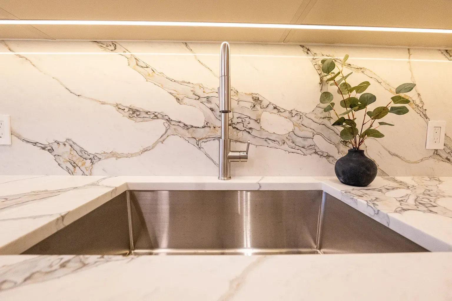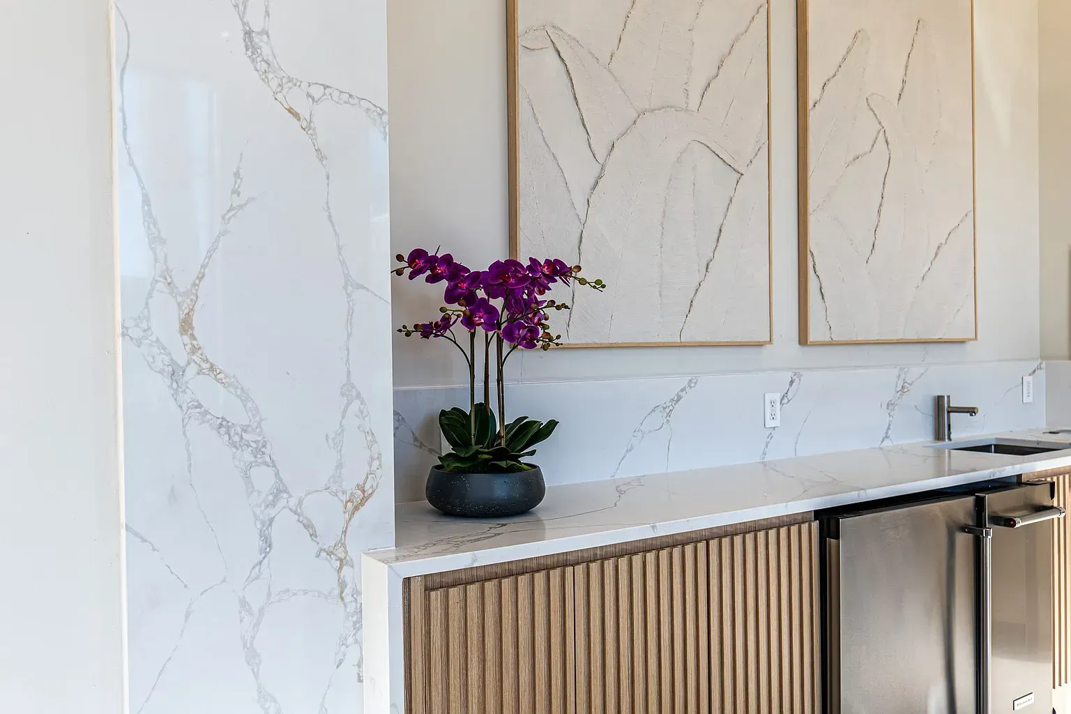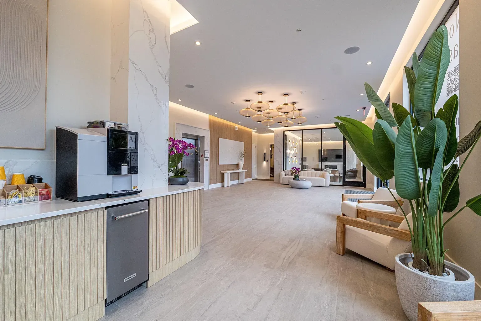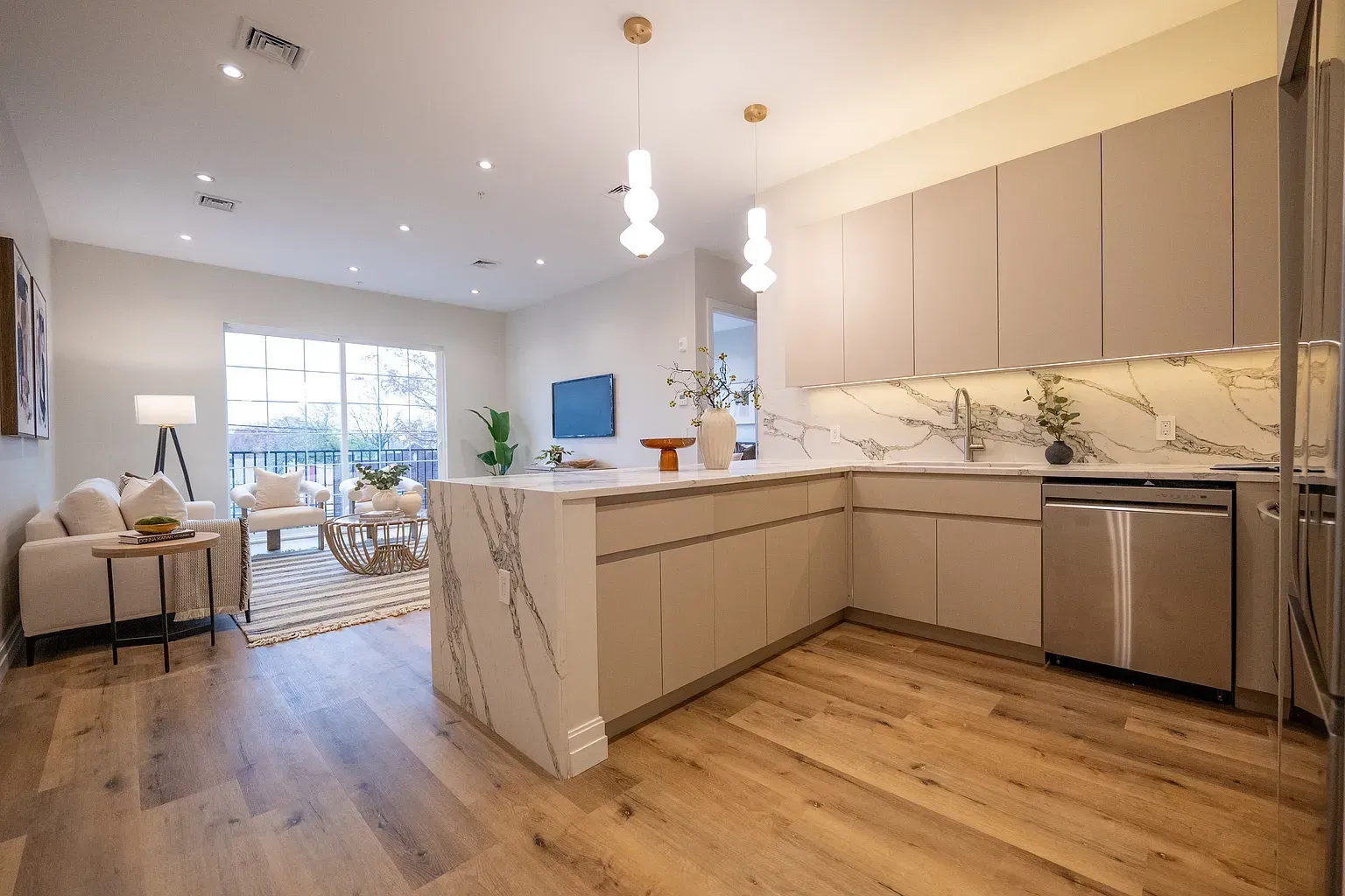Choose from magazine-designed one-bedroom or two-bedroom layouts and enter a space where modern convenience meets exquisite design. Your dream apartment features massive waterfall island kitchens stretching over 10 feet, adorned with deep-veined Calacatta grey quartz countertops and backsplashes. Custom soft-close cabinetry and premium stainless-steel appliances, including a side-by-side refrigerator with a water and ice maker, complement the kitchens. All kitchens are equipped with exterior exhausts for optimal ventilation during cooking.