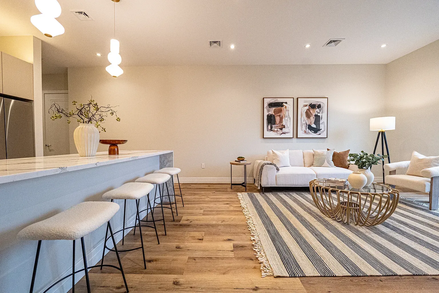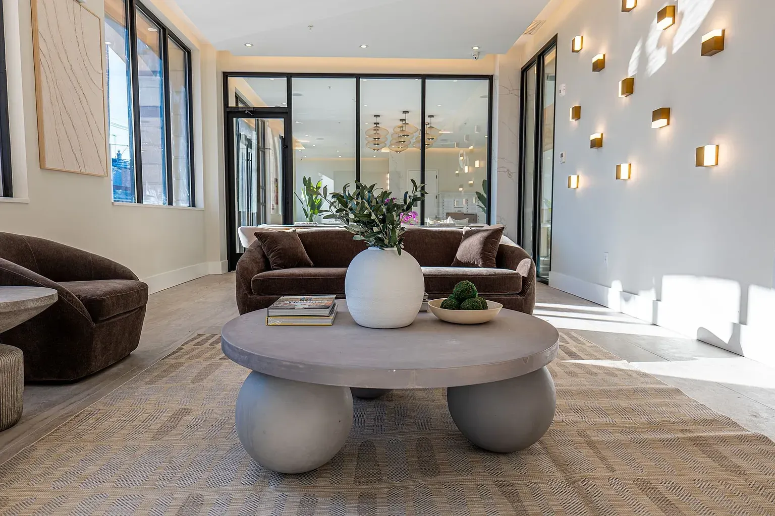 Soaring ceilings, European double-hung windows, and oversized sliding doors flood the space with natural sunlight, creating an airy, open ambiance. Many apartments feature outdoor patios, and select units include expansive outdoor decks wrapped in Aztek, offering the perfect setting to enjoy the outdoors in comfort and style.